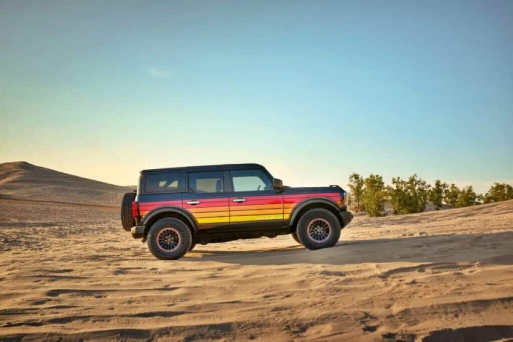 차체 측면에는 일몰을 연상시키는 반사형 빨강, 주황, 노랑의 스트라이프가 그려져 있으며, 은색 그릴에는 붉은 윤곽의 ‘BRONCO’ 레터링이 새겨져 있다.