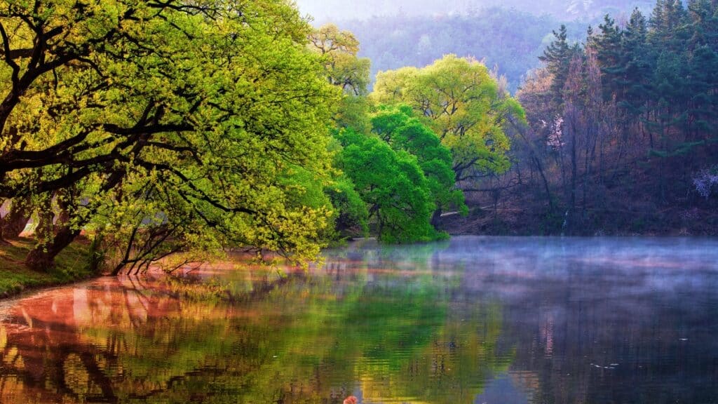 해뜨기 직전의 푸르스름한 공기, 또는 해 질 무렵의 붉은 노을이 반영과 만나는 장면은 하루 중에서도 가장 극적인 순간을 연출한다.