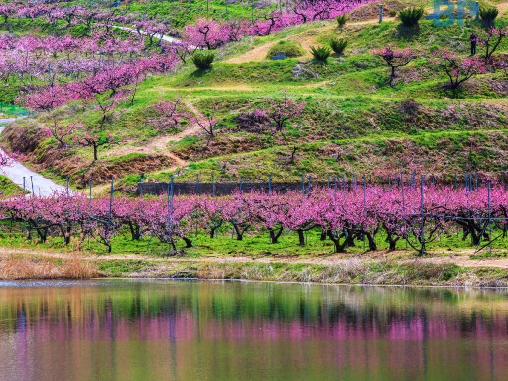 봄철, 반곡지는 복사꽃으로 유명하다. 매년 4월 초순이면 저수지 둘레를 따라 연분홍빛 복사꽃이 일제히 피어나 마치 화폭 속 풍경처럼 느껴지는 장면이 펼쳐진다.