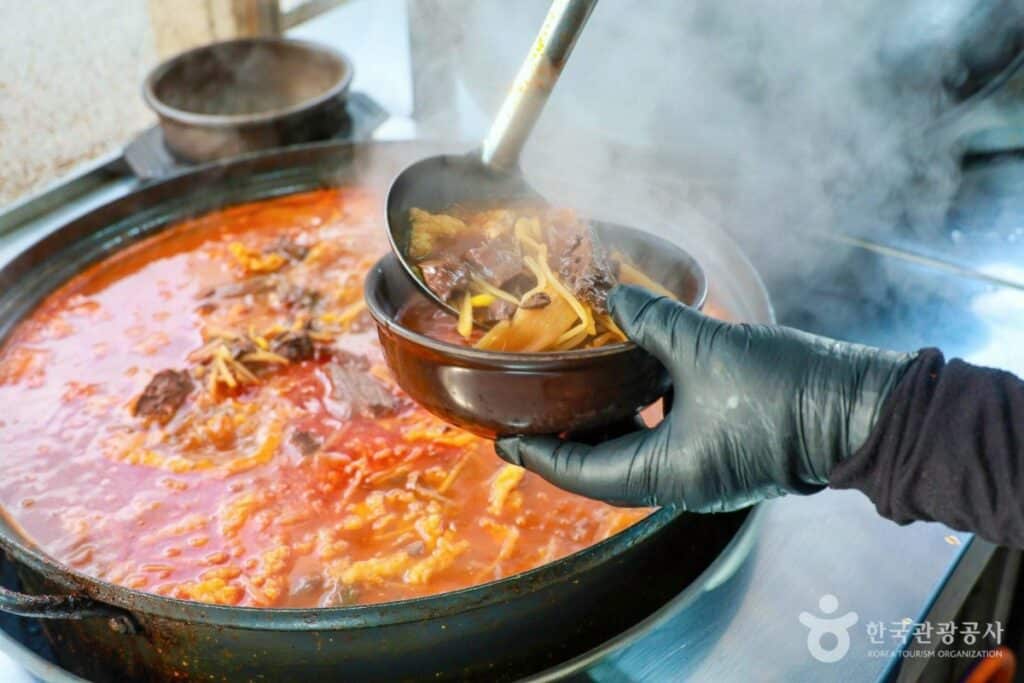 창녕전통시장의 대표 음식은 단연 ‘수구레국밥’이다. 수구레는 소 한 마리 당 2kg만 나오는 특수 부위로, 쫄깃한 식감과 깊은 풍미를 자랑한다.