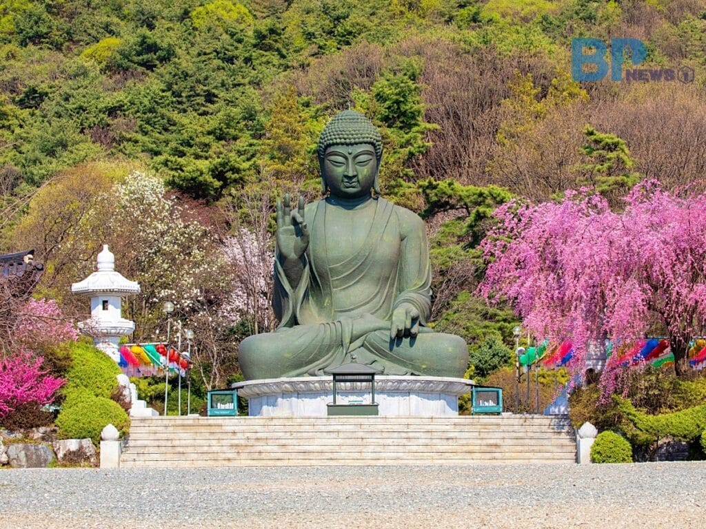 높이 15m, 둘레 30m에 이르는 이 좌불상은 온화한 미소로 방문객을 맞이하며, 그 앞에 펼쳐진 벚꽃 풍경은 한 폭의 그림처럼 장관을 이룬다.
