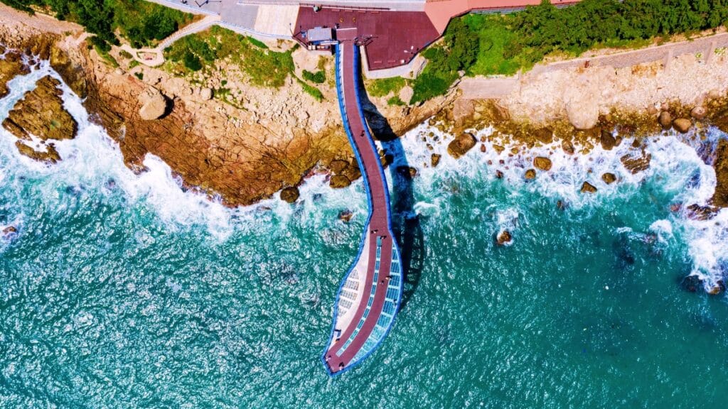 해안선을 따라 걷다가 전망대 끝에 다다르면 발밑의 투명 유리가 바다 위를 걷는 듯한 착각을 불러일으킨다.