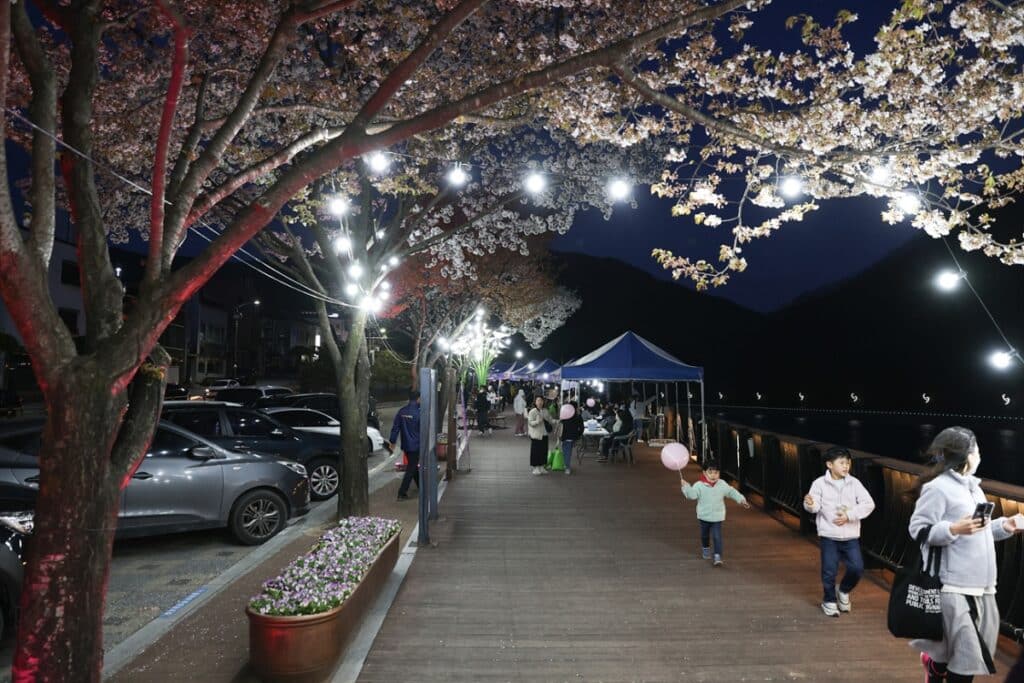 충청북도 단양에서 남한강을 따라 이어지는 1.3킬로미터 구간에서 벚꽃의 야간 경치를 즐길 수 있는 독특한 이벤트가 마련되었다.