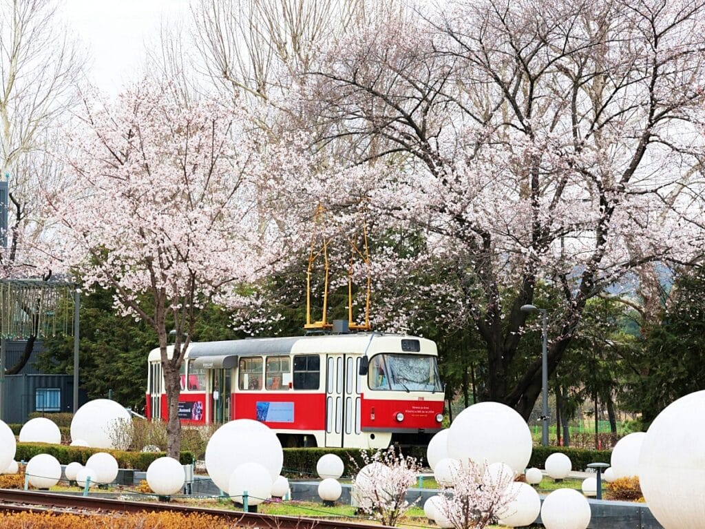 기존의 폐선을 활용해 산책길로 탈바꿈시킨 공간에는 미카 증기기관차, 협궤열차, 체코·히로시마 노면전차 등 실제 열차들이 전시되어 있어, 마치 기차역으로 돌아간 듯한 분위기를 자아낸다.