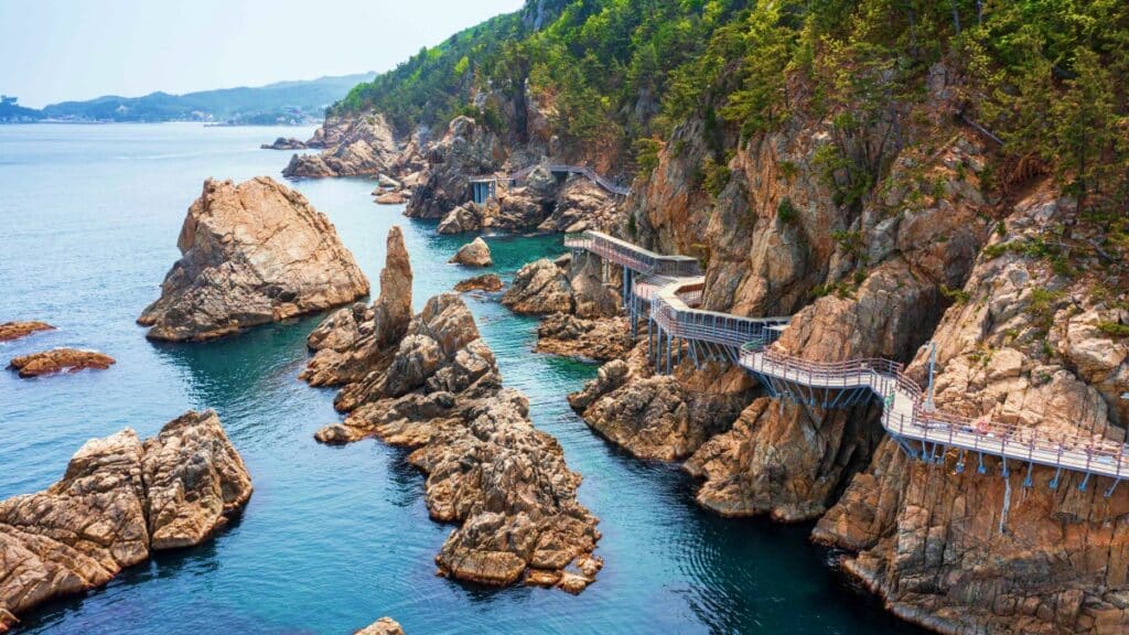 바다를 바로 옆에 두고 걷는 이 길에서는 투명한 유리 위로 파도치는 동해를 내려다볼 수 있고, 자연이 빚은 기암괴석을 따라가다 보면 전설이 깃든 용굴과 사자 얼굴을 닮은 바위까지 만난다.
