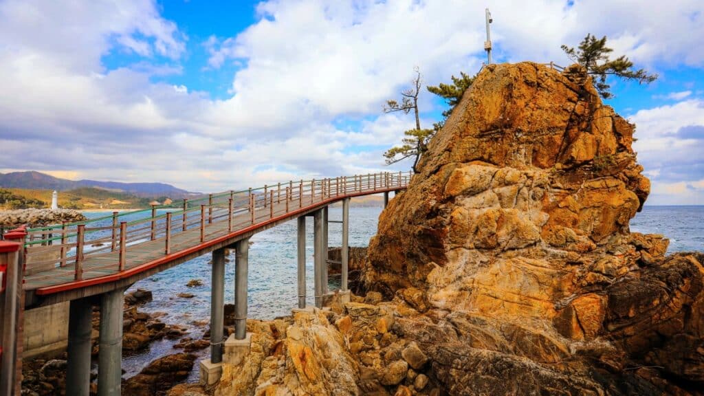 해안 절벽을 따라 조성된 이 산책로는 걷는 시간만큼 감탄이 쌓이는 곳이다. 거센 파도를 머금은 동해의 겨울 풍경이 눈앞에 펼쳐지고, 바다 위에 설치된 출렁다리 위에 서면 해풍과 함께 아찔한 스릴도 더해진다.