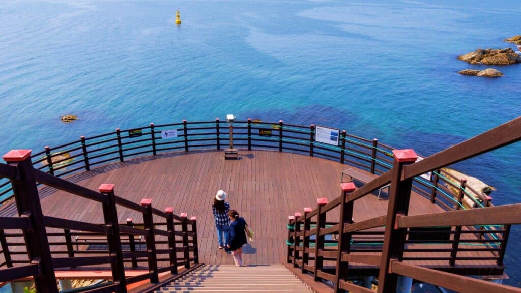 길의 하이라이트는 단연 출렁다리다. 높이 11미터 지점에 설치된 이 다리는 중간 바닥이 유리로 되어 있어 그 위를 걸을 때마다 발밑으로 넘실대는 파도가 그대로 보인다.