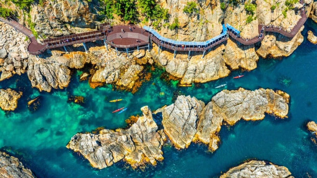 이 중 데크 구간은 512미터, 출렁다리는 56미터로 구성되어 있으며 전체 코스가 바다와 맞닿아 있어 걷는 내내 해안 절경을 가까이에서 감상할 수 있다.