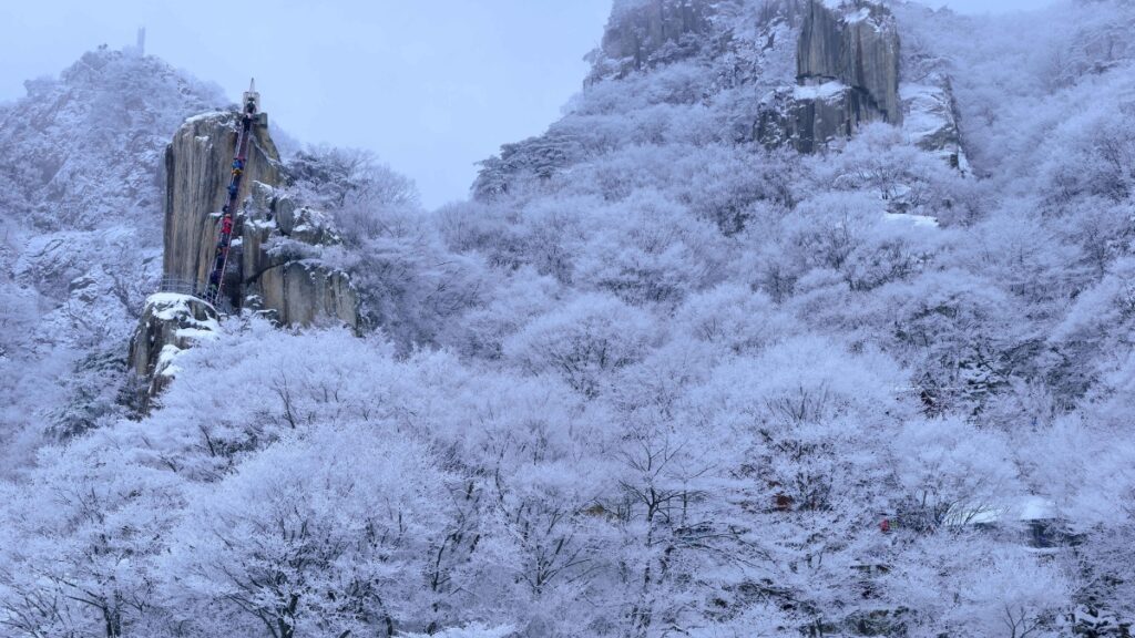 바위틈마다 내려앉은 눈, 흰빛으로 덮인 산 능선, 미세먼지 없는 겨울 하늘이 겹쳐지며 이곳만의 압도적인 풍경을 만든다.