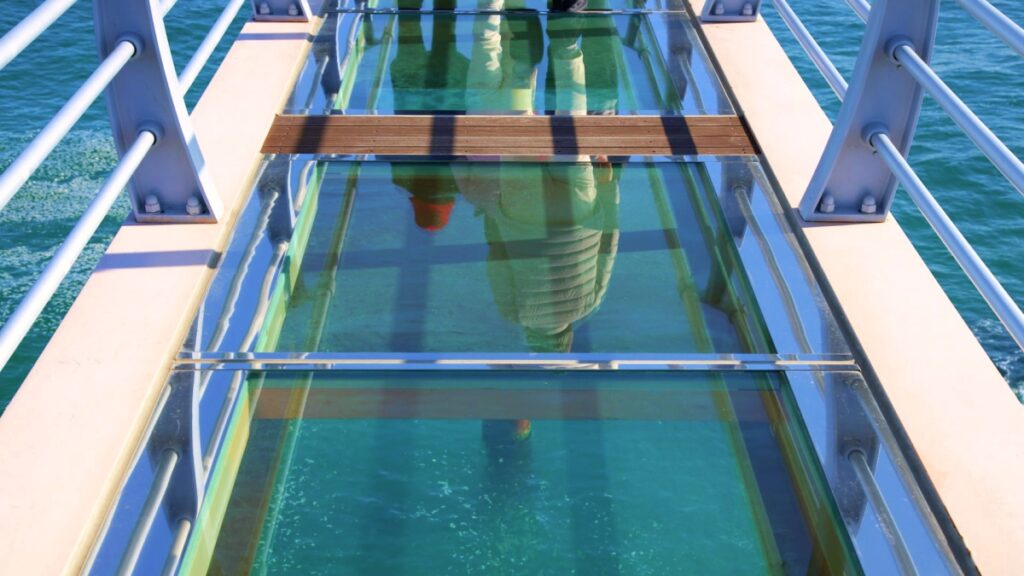 투명 유리를 통해 아래로 보이는 바다는 보는 이로 하여금 일시적으로 평형감을 잃게 할 만큼 몰입감 있는 시각적 경험을 제공한다.