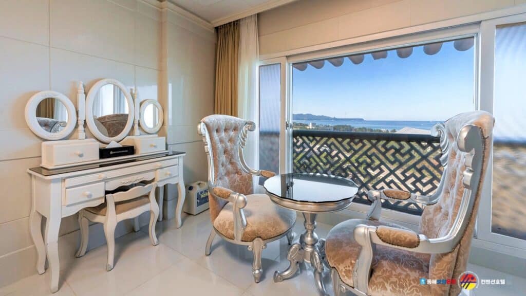 창문 너머로 동해의 수평선을 바라보며 머물 수 있어 실내에 머무는 시간 자체가 하나의 힐링이 된다. 객실 인테리어는 전체적으로 화이트 톤이 중심을 이루며, 침구와 가구 또한 깔끔하게 정돈돼 안정감을 더한다.