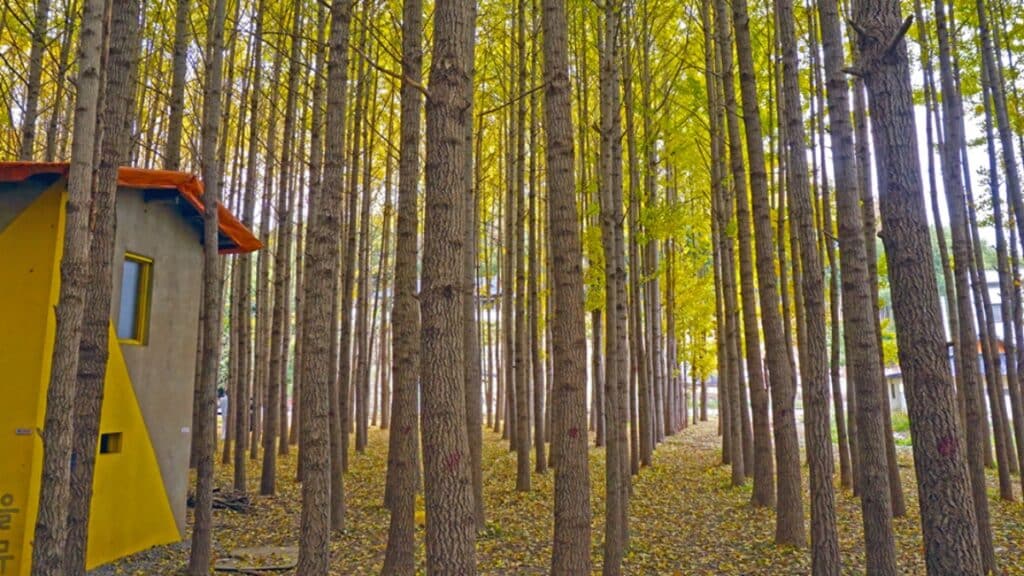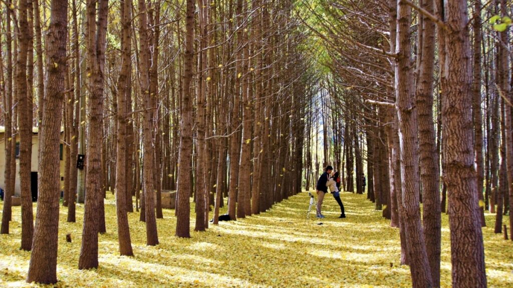 이 은행나무들이 노랗게 물드는 시기면, 햇살에 반사된 잎사귀들이 숲 전체를 황금빛으로 물들이며 사진작가들의 렌즈를 유혹한다.