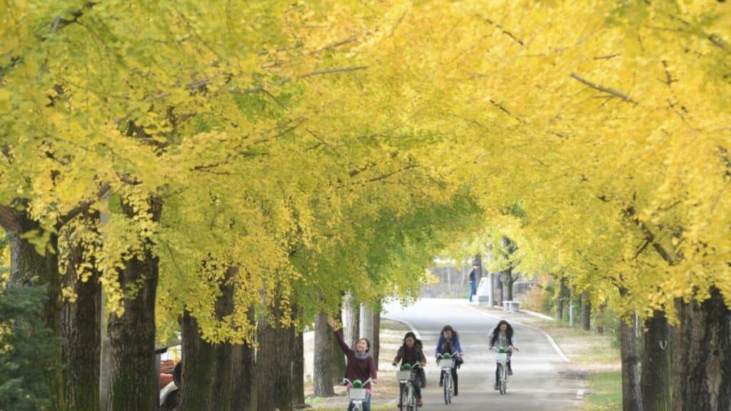 은행나무는 도로를 따라 줄지어 서 있고, 늦가을이면 나뭇잎이 바닥에 두텁게 쌓인다. 은행잎이 떨어지는 시기엔 바람 한 번에도 장면이 바뀌는 듯한 역동적인 풍경이 연출된다.