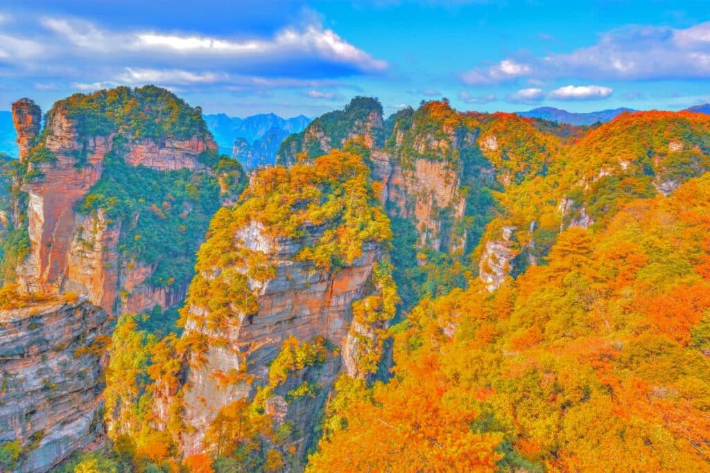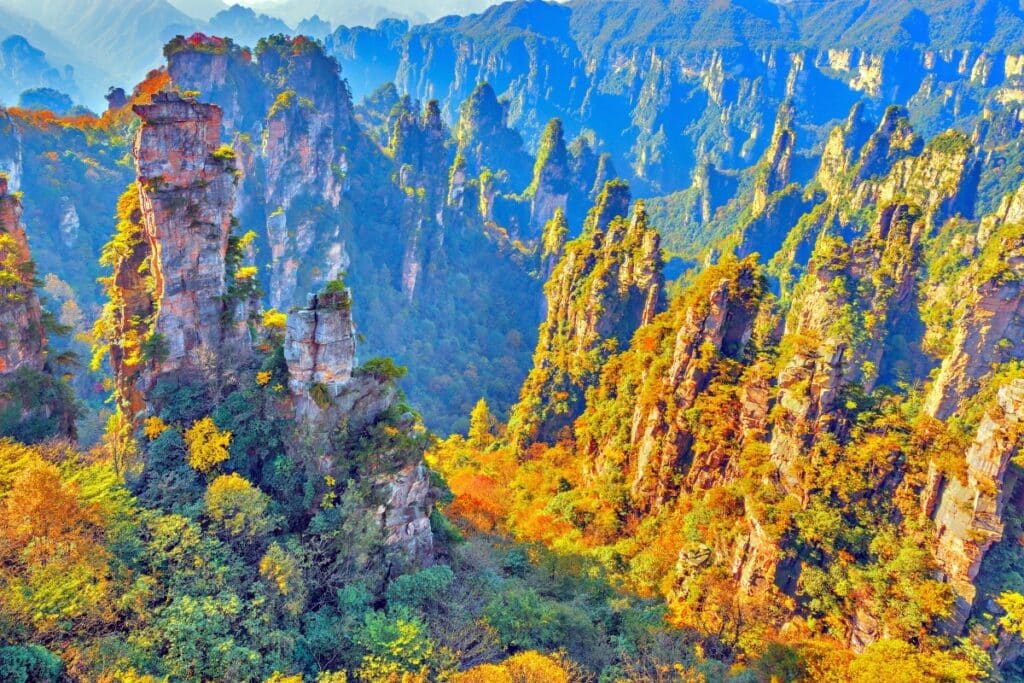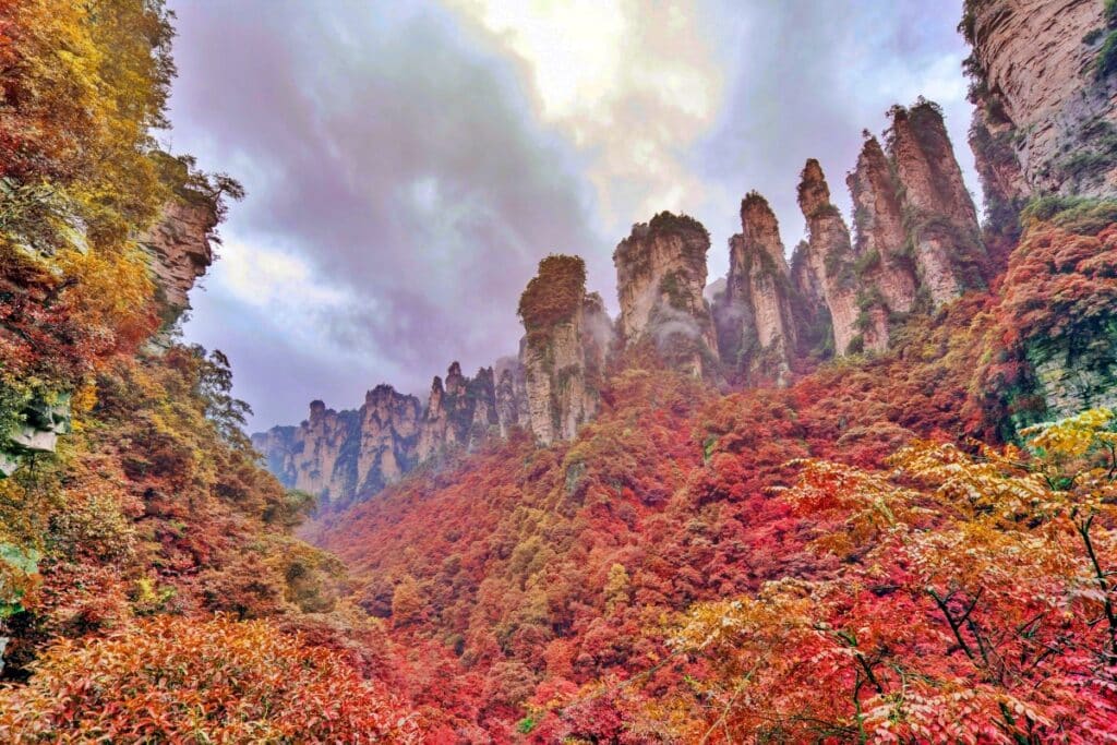 장가계에는 석영 사암으로 이루어진 봉우리들이 숲처럼 이어진 십리화랑(十里畫廊)이 있어, 산책로를 따라 천천히 걷다 보면 가을 단풍 속에 물든 절경을 감상할 수 있다.