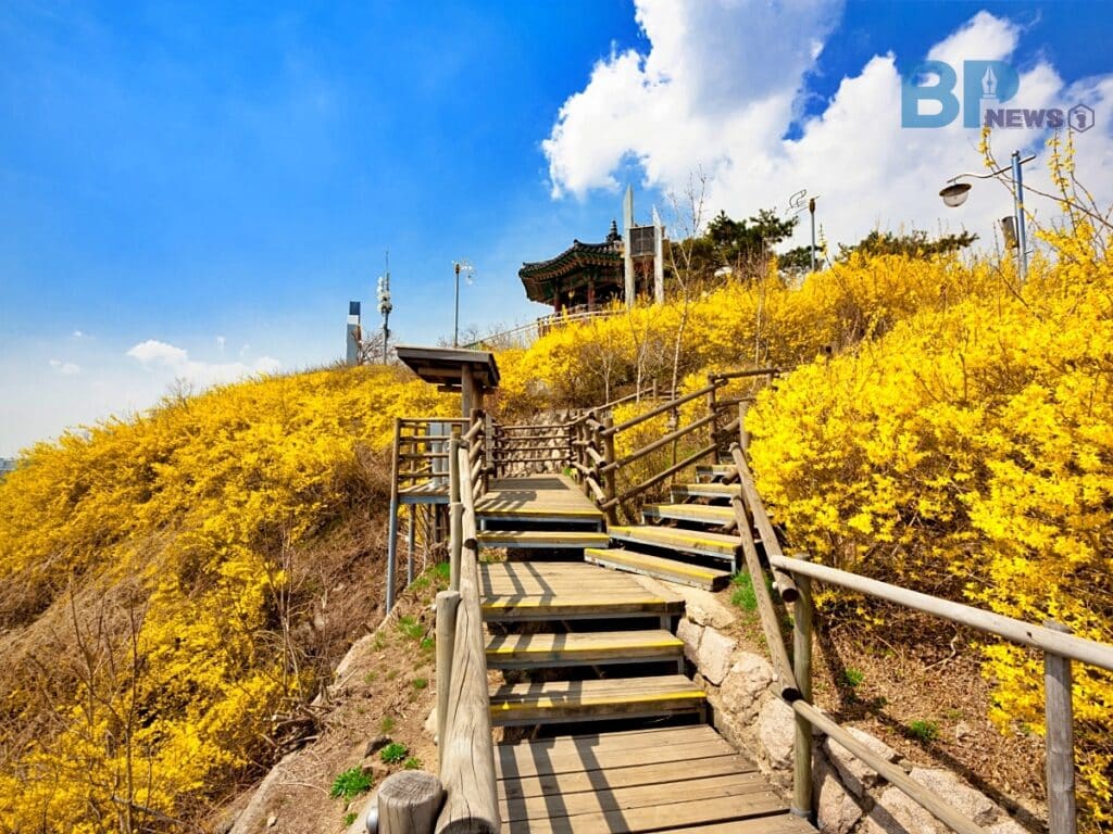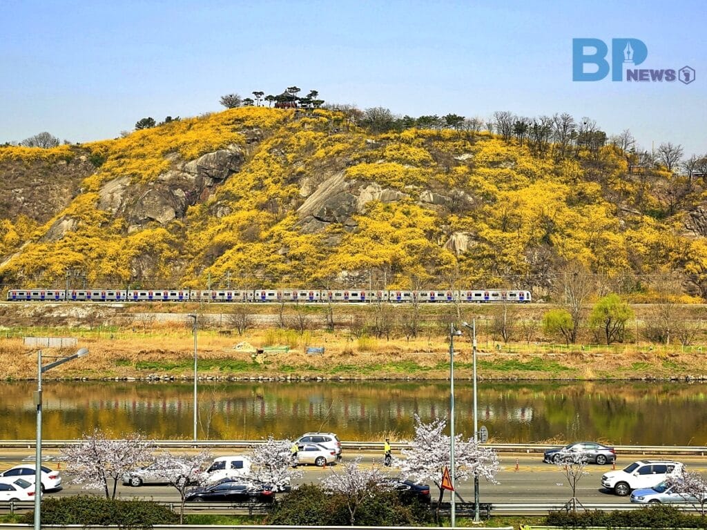 응봉산은 서울에서 개나리를 가장 먼저 볼 수 있는 대표적인 명소로 꼽히며, 이맘때가 되면 산 전체가 노란 물결로 물든다.