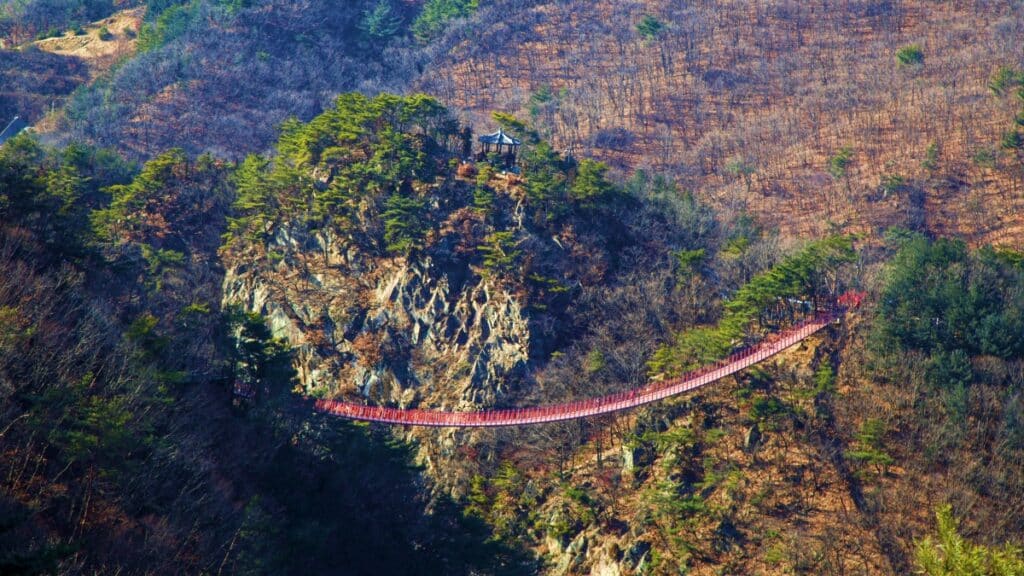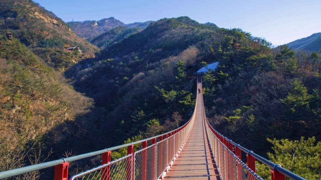 길이 150미터, 폭 1.5미터의 이 출렁다리는 단순한 ‘출렁임’ 이상의 감각을 선사한다. 차가운 1월의 공기 속에서 자연과 맞닿은 하늘길을 걷는 경험은 흔치 않다.