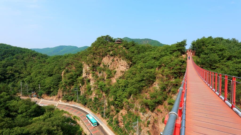 출렁다리 입구까지는 전용 주차장에 차량을 주차한 뒤 도보로 약 10~15분간 완만한 경사를 오르게 된다. 경사가 심하지 않아 노약자나 아이를 동반한 방문객도 무리 없이 접근할 수 있다.