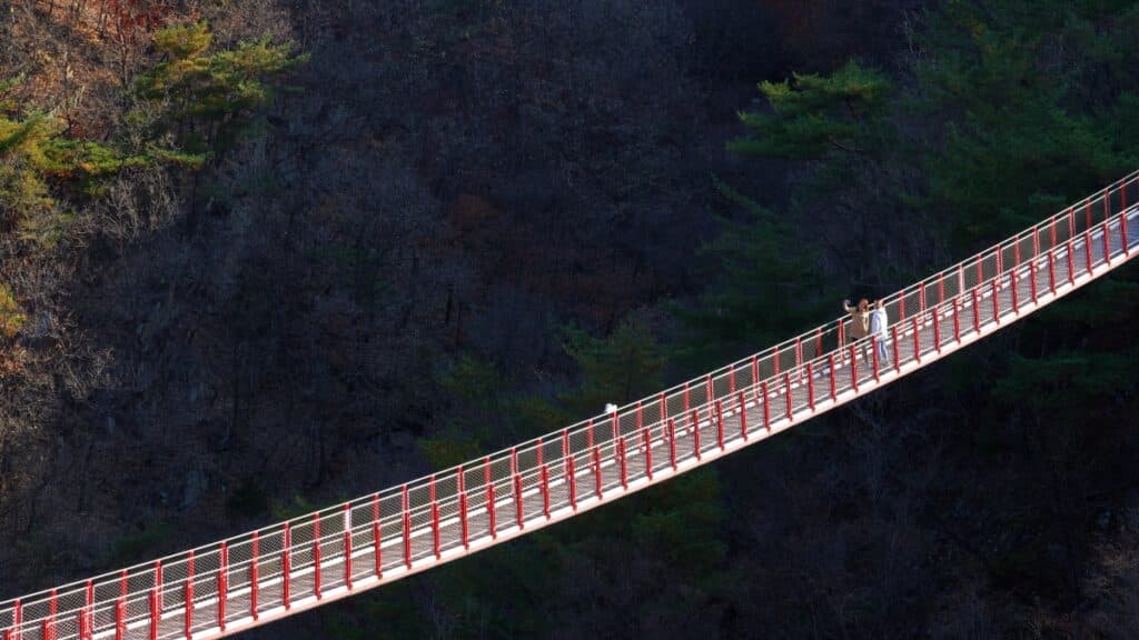바닥은 투명 유리가 아니지만, 다리의 높이감과 자연 지형의 깊이가 어우러져 긴장감 있는 감상을 제공한다.