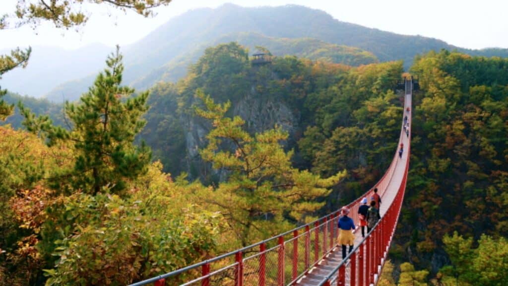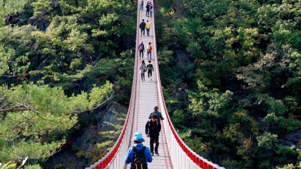 출렁다리를 건너는 짧은 체험만으로도 깊은 자연을 체감할 수 있고, 이후에는 빙벽으로 유명한 겨울 폭포까지 이어지는 구성도 만족스럽다.