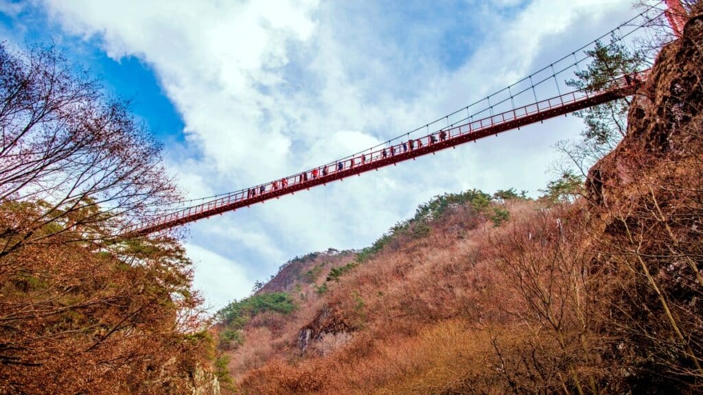 흔히 ‘구름다리’로 불리는 이 다리는 공중에 매달린 듯한 외형으로, 이동 중 다리의 흔들림이 일정한 긴장감을 유발한다. 아래로는 숲과 바위, 계곡이 펼쳐져 있으며 이 다리를 건너는 경험은 강천산을 대표하는 콘텐츠로 자리 잡고 있다.