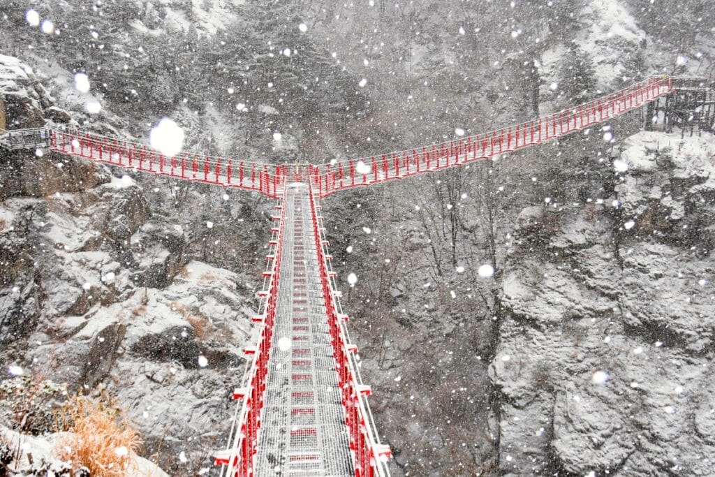 한편 이곳은 겨울에 한층 더 아름다워진다. 붉은 출렁다리와 순백의 풍경이 겨울 특유의 고즈넉한 분위기를 자아내니 이 시기를 놓치지 말자.