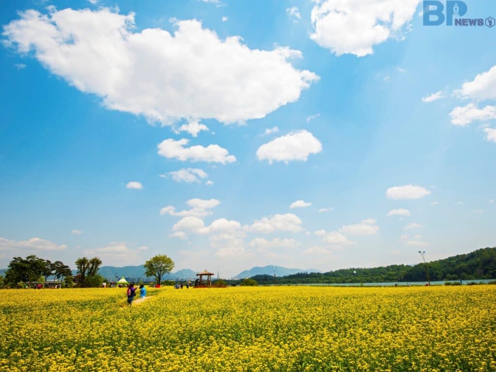 따뜻한 햇살 아래 유유히 흐르는 강과 노란 꽃밭이 어우러진 풍경은 보는 이의 감탄을 절로 자아낸다.