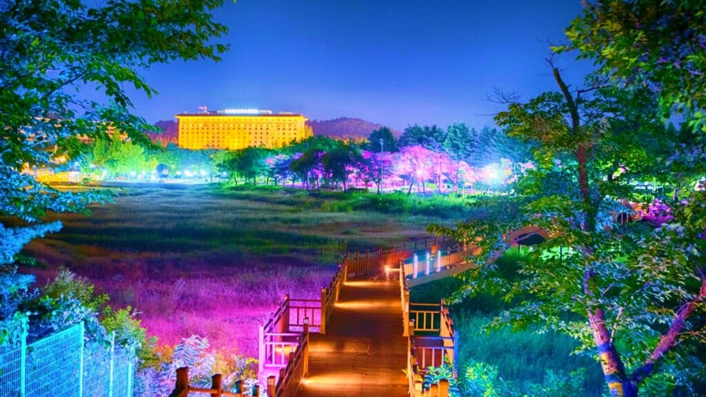 호수를 한 바퀴 둘러 걷는 이 산책로에는 경관 조명이 촘촘히 설치돼 있어 밤에도 안전하게 걸을 수 있으며 물 위에 반사되는 조명과 맞은편 시설의 불빛이 어우러져 환상적인 분위기를 자아낸다.