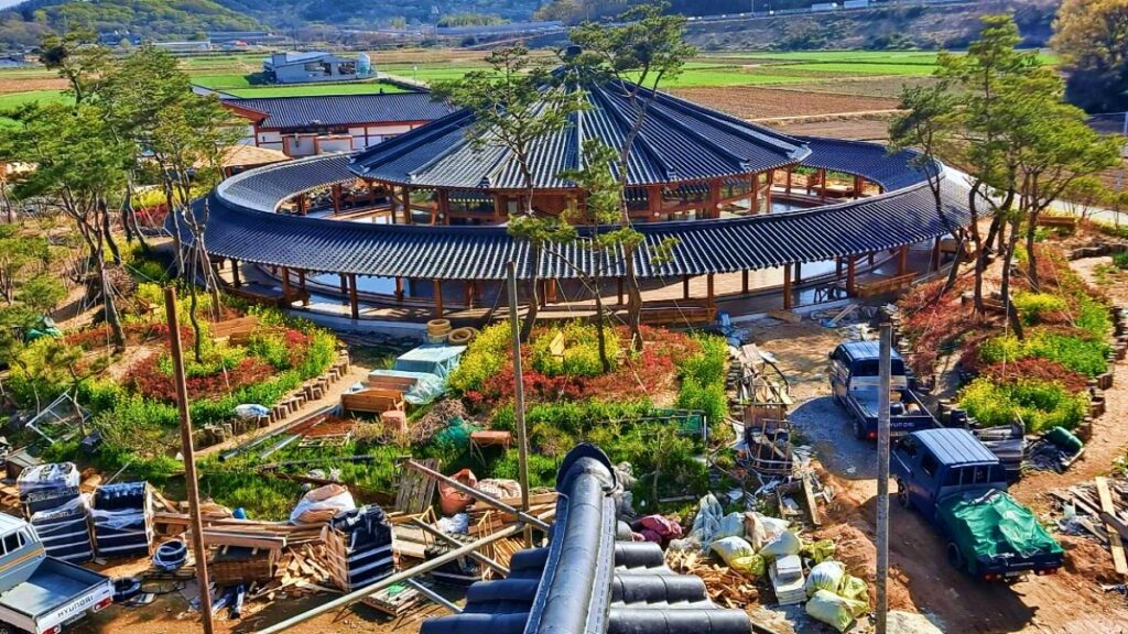 원형 한옥 위로 365일 내내 인공 수로를 따라 물이 흐르며 사계절 내내 고요한 비의 감각을 전한다.
