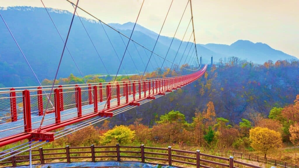 계곡 사이 붉은 철제 다리 위, 바람은 시원하지만 발아래 풍경은 아찔하다. 흔들림을 즐기러 왔지만, 다리 끝에선 절경이 먼저 시선을 사로잡는다. 단풍은 아직 이르지만 이미 하늘은 가을빛이다.