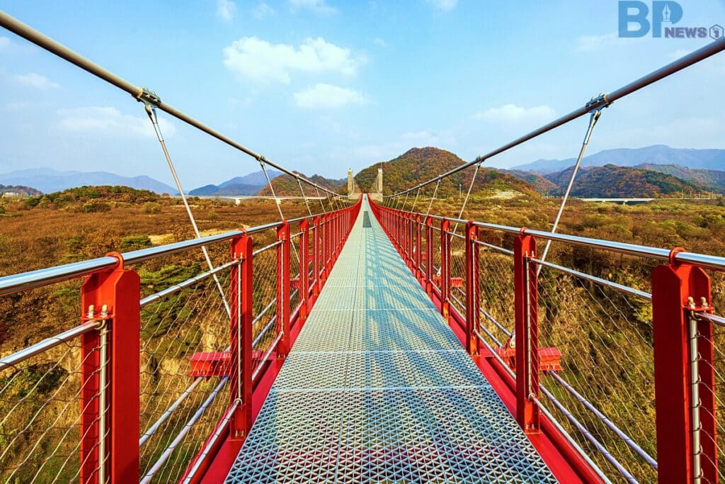 교량은 붉은 철제 구조로 설계되어 주변 자연과 강렬한 대비를 이루며 계곡 위에 놓인 독특한 형태는 다리 자체만으로도 이색적인 시각적 경험을 제공한다.