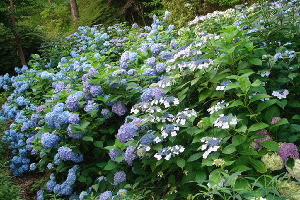 황매산수목원은 전시 온실 가는 길에 나무 수국이 풍성하게 피어나 아름다운 여름의 풍경을 완성한다.