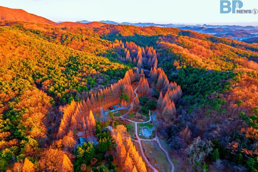 특히 공원 중심부에 위치한 전망대에서는 관모산 능선을 가로지르는 단풍과 설경을 한눈에 내려다볼 수 있어 사진 명소로도 이름이 알려져 있다.