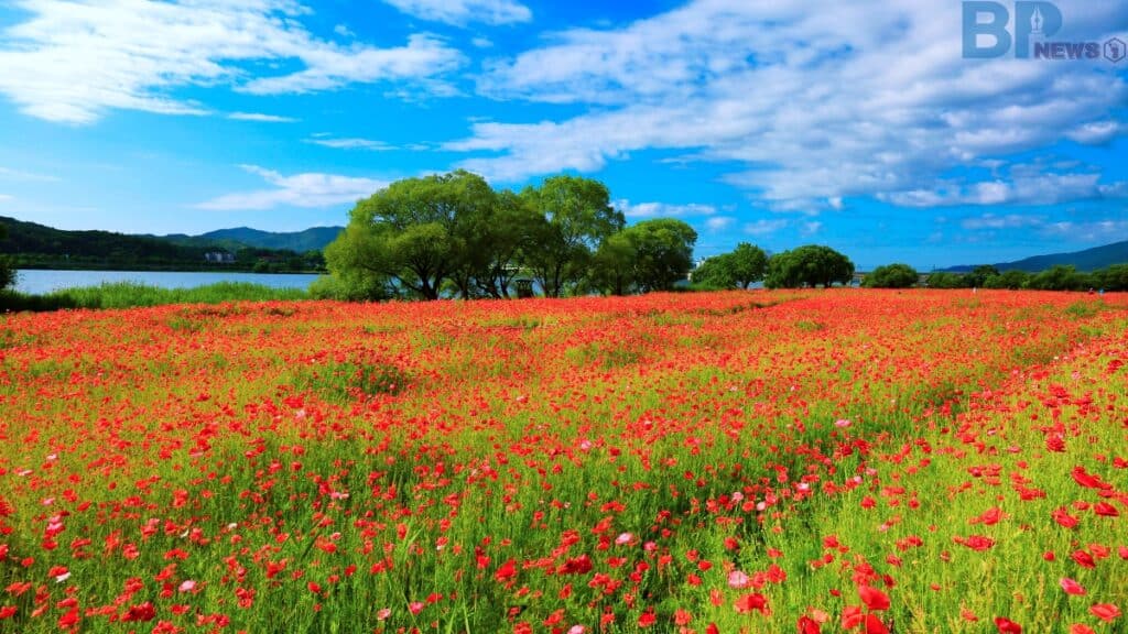 물의 정원이 특별한 이유는 그 규모와 풍경만이 아니다. 봄에는 붉은 꽃양귀비가, 가을에는 황화코스모스가 공원 전체를 물들이며 계절에 따라 전혀 다른 분위기를 자아낸다.