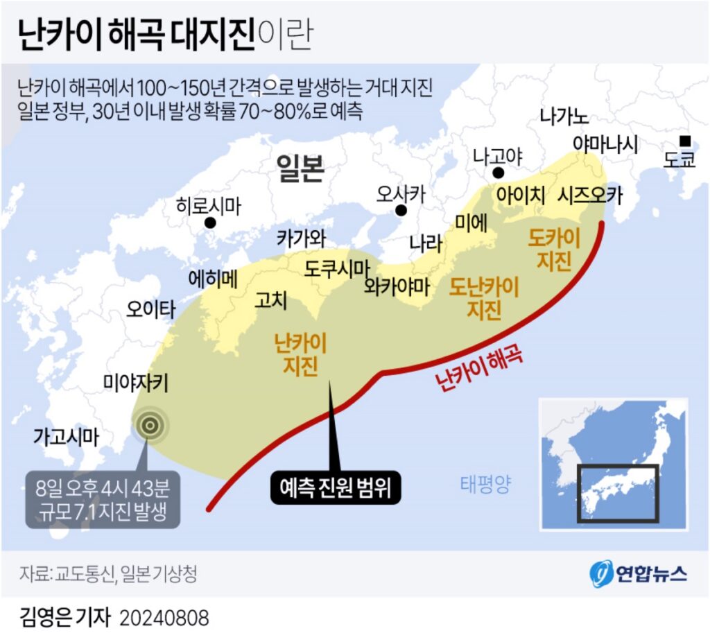 지난 8일 일본 기상청은 규슈 미야자키현 앞바다에서 규모 7.1 지진이 발생한 후 ‘난카이 해곡 지진 임시 정보'(거대 지진 주의)를 발표했다.