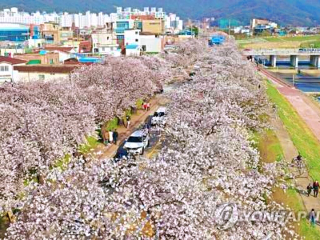 전북 정읍에서는 매년 봄이면 도심을 가로지르는 하천을 따라 벚꽃이 이어지며 봄 축제가 열린다.