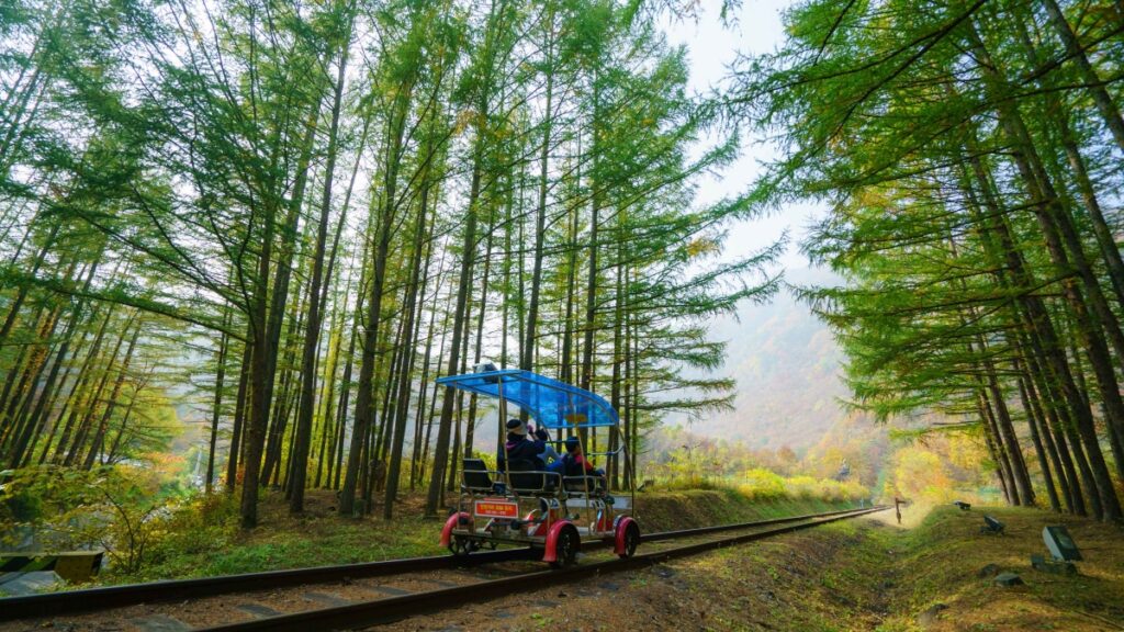 아직 단풍은 시작되지 않았지만 짙은 녹음을 품은 풍경은 충분히 생생하다. 페달을 밟는 발끝에는 서두름이 없고, 바퀴는 철로 위를 따라 일정하게 굴러간다. 기차 대신 자전거 페달을 밟으며 이동하는 이 특별한 체험은 우리가 흔히 아는 ‘여행’의 틀을 벗어나 있다.