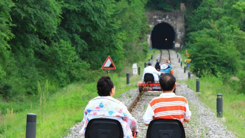 강원특별자치도 정선군 여량면 노추산로 745에 위치한 ‘정선레일바이크’는 우리나라 최초의 레일바이크 체험지로, 정선선의 폐선을 활용해 7.2킬로미터 구간을 여행자에게 개방하고 있다.