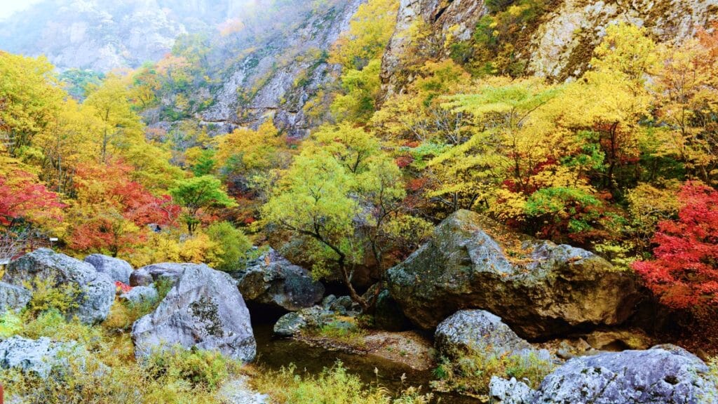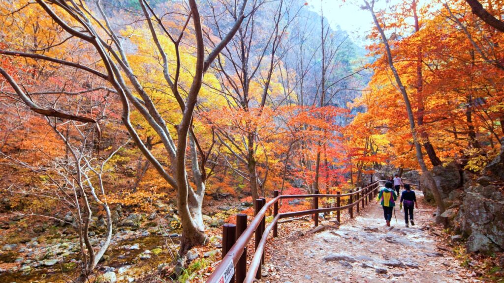 아직은 이른 시기라 붉은색보다는 녹음이 짙지만, 약 2주 후면 고요한 산과 계곡이 단풍으로 물들기 시작한다. 산 전체가 암석 병풍처럼 둘러싸여 있어 산세는 험해 보이지만 정작 걷는 길은 부드럽게 이어진다.