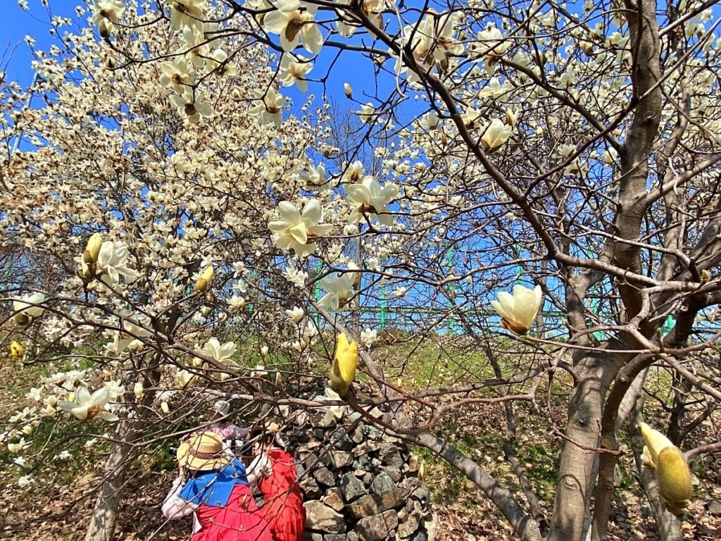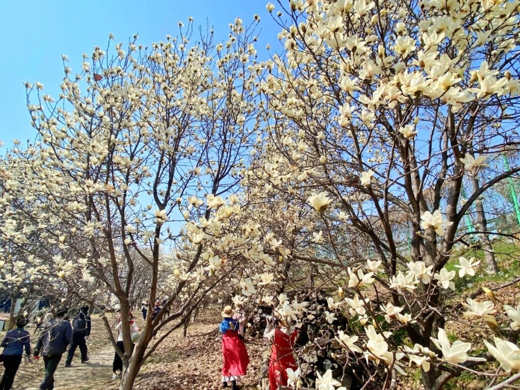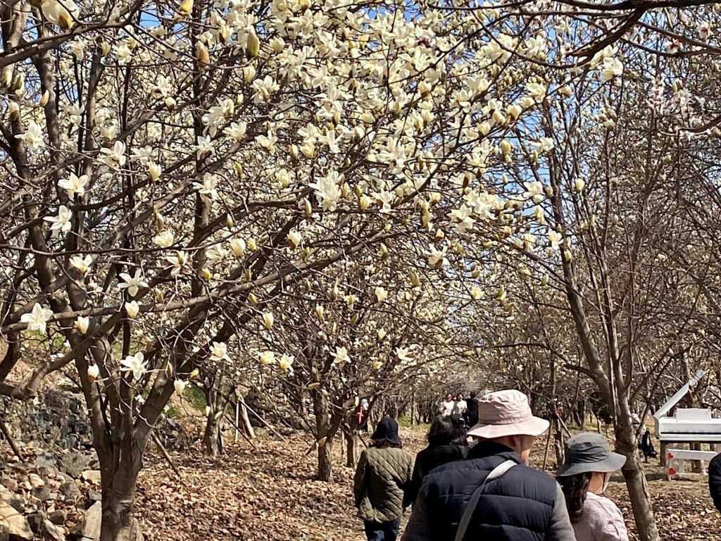 SNS에서 빠르게 화제가 되고 있는 김해시민의 숲 목련 군락지는 이번 주말(3월 23~24일)이 절정으로 예상된다.
