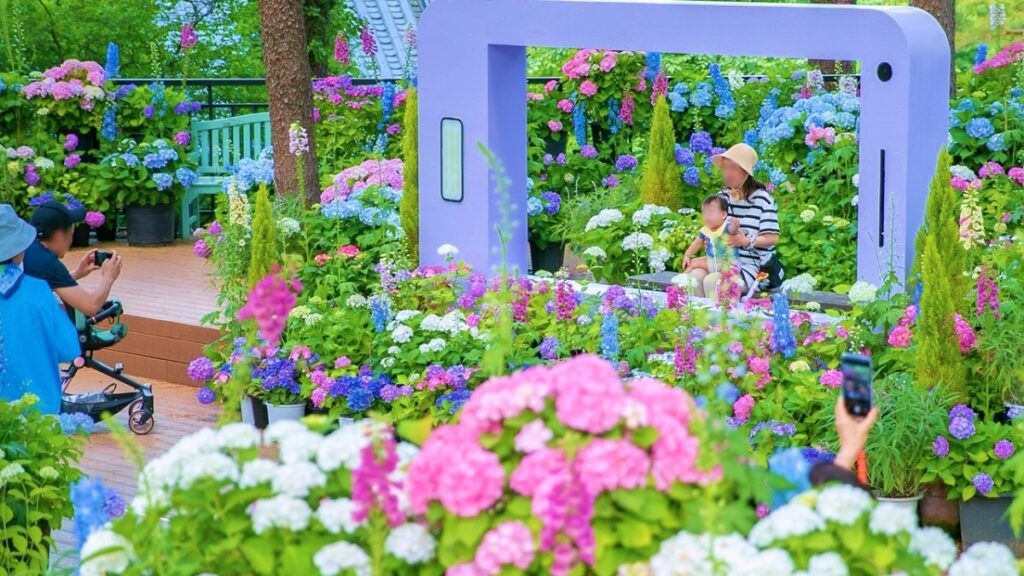 여기에 지난해보다 1,500분의 수국이 추가되어 전시 규모는 물론 포토존 구성도 더욱 풍성해졌다. 아이리스, 달리아, 알리움 등 여름꽃도 함께 어우러져 사진 촬영이나 산책을 즐기기에 적합한 분위기를 조성한다.