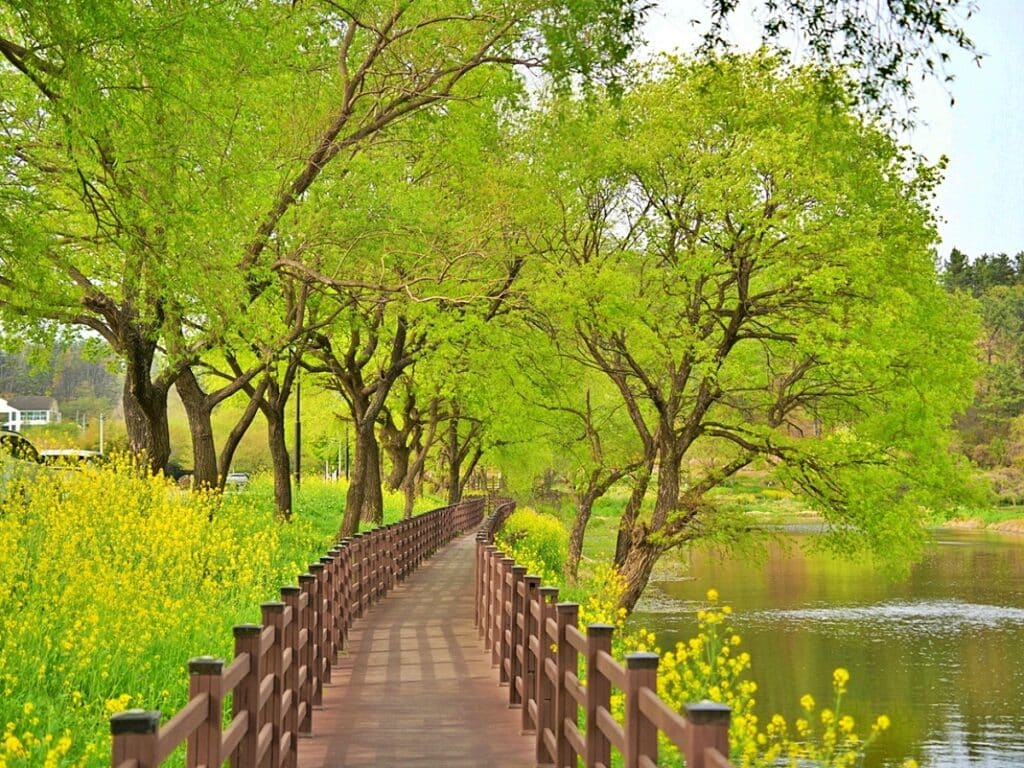 금장대는 유채꽃과 갓꽃이 만개하는 시기에 특히 방문하기 좋으며, 다양한 꽃들이 봄날의 싱그러움을 더해준다.