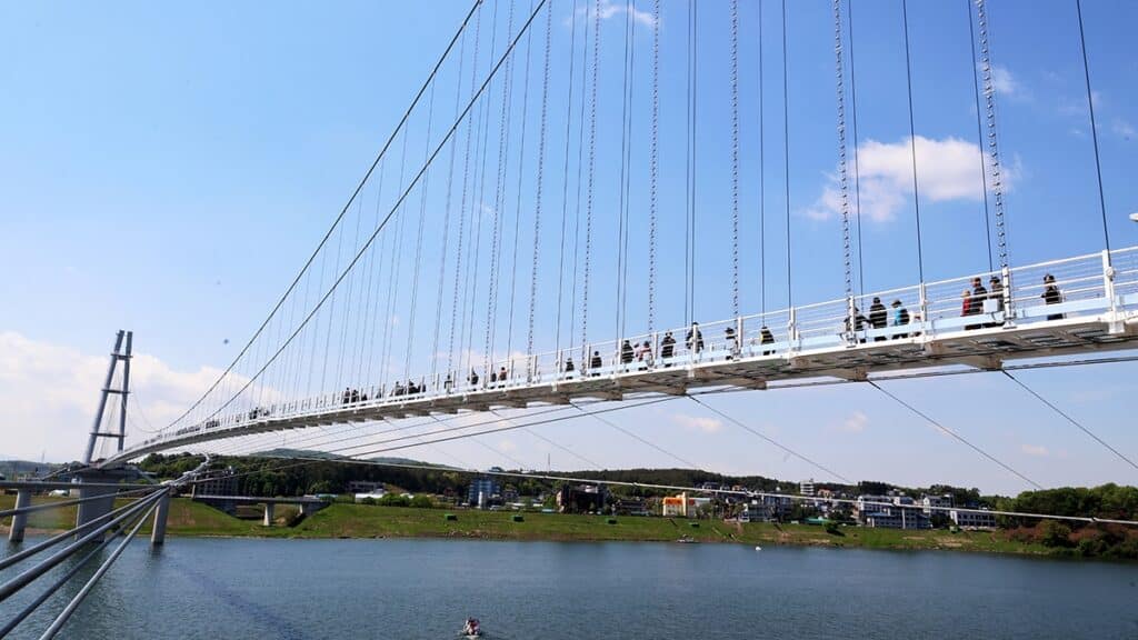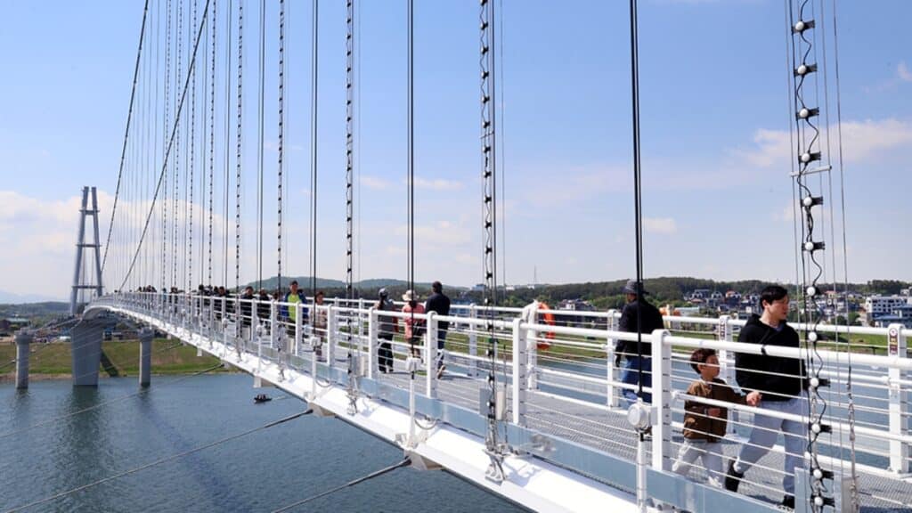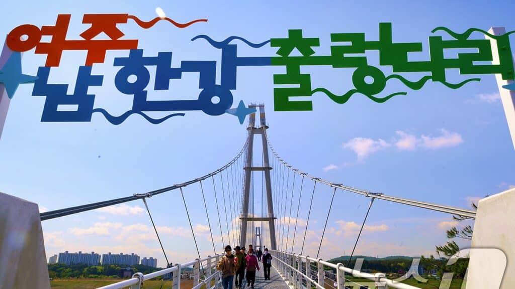 경기도 여주시 강문로 8-578에 위치한 ‘남한강 출렁다리’는 총길이 515미터, 폭 2.5미터 규모로 조성된 보행자 전용 현수교다.