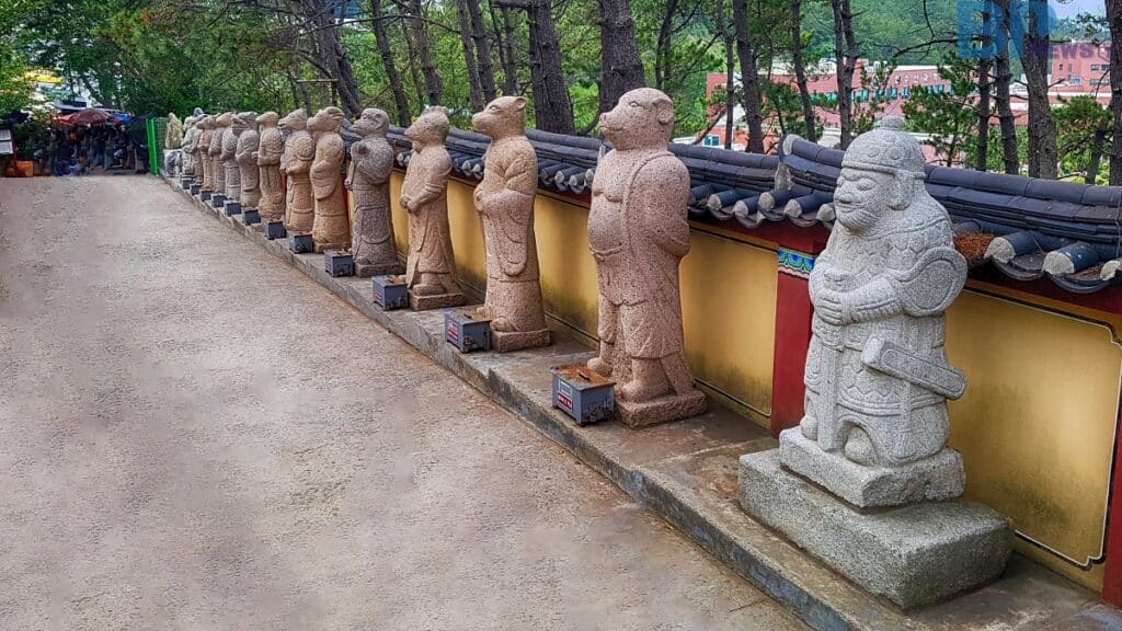 사찰 내부에는 자녀를 바라는 이들이 자주 찾는 ‘득남불’로 불리는 미륵좌상 석불이 봉안돼 있으며, 대웅전 앞의 사사자 석탑과 용 조각물 등은 해양 신앙과 불교 상징이 결합된 독특한 분위기를 연출한다.