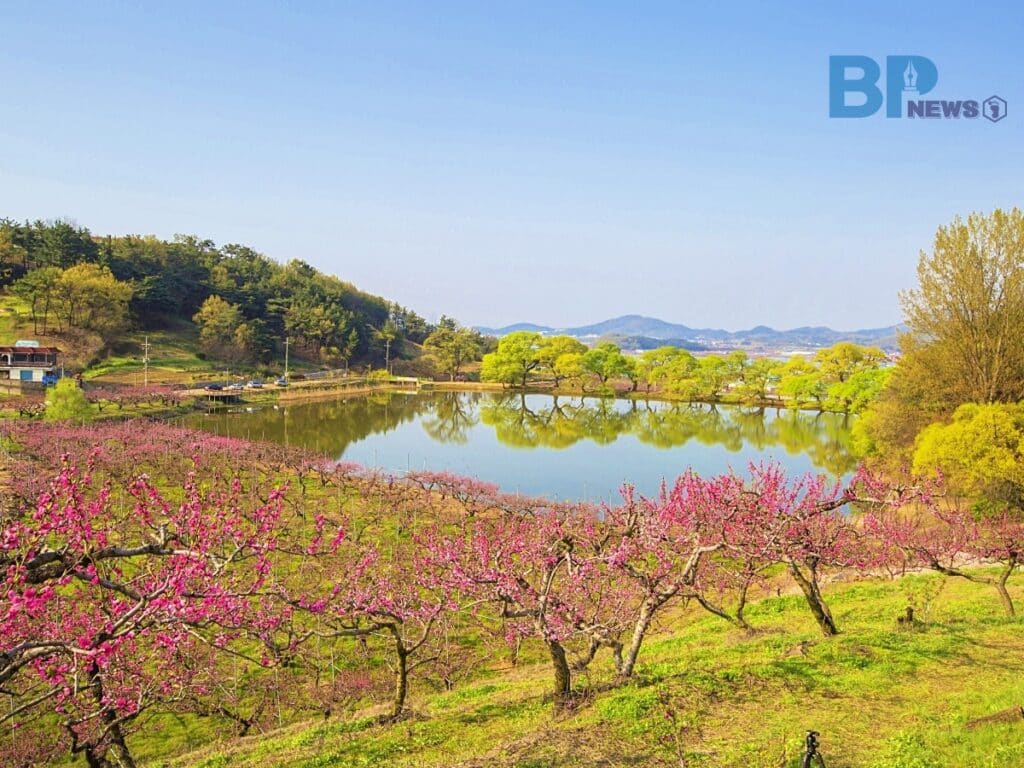 4월 중순, 벚꽃이 하나둘 지고 난 자리를 분홍빛 복사꽃이 이어받았다. 경북 경산시 남산면 반곡지에는 지금, 이번 주를 마지막으로 봄의 끝자락에서 사라지고 있다.