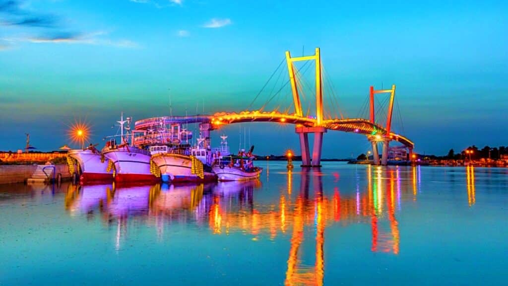 충청남도 태안군 안면읍 백사장항과 남면 드르니항을 잇는 꽃게다리, 공식 명칭 ‘대하랑 꽃게랑 인도교’는 길이 250m의 해상 인도교다.