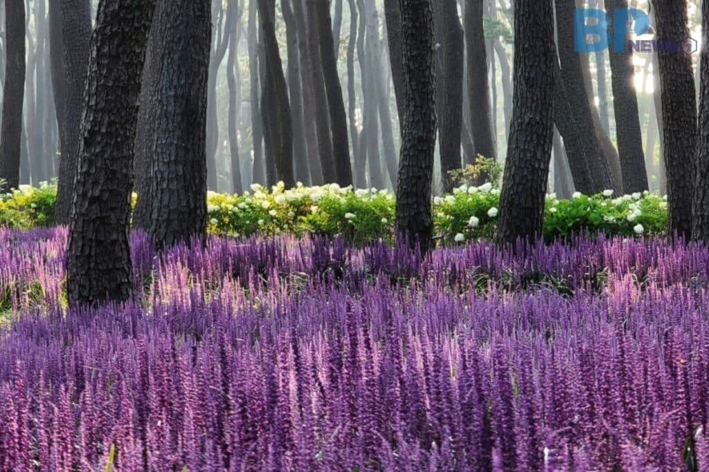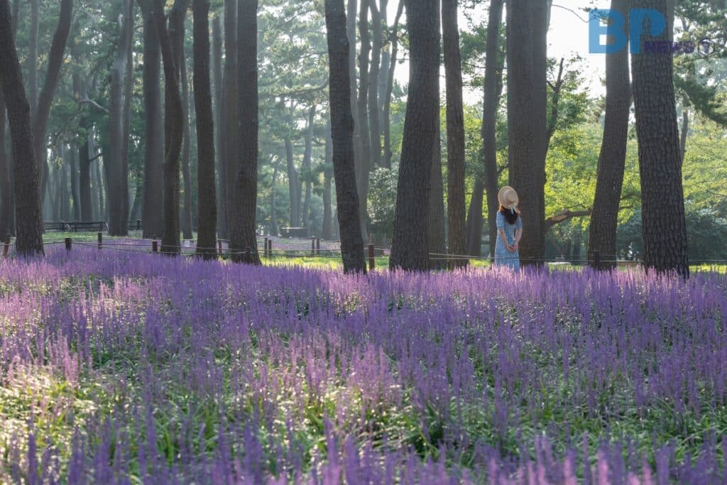 1만 5천 그루의 송림 군락지 밑에서 자라난 보랏빛 맥문동은 아름다운 군락지를 이루어 빼어난 여름 풍경을 그림처럼 그려낸다.