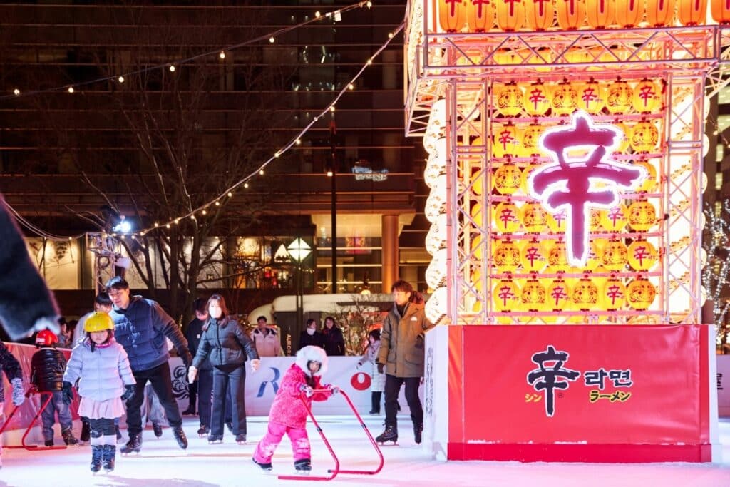 농심이 설치한 ‘신라면 스마일링크 삿포로’는 오도리공원에 마련된 스케이트장으로, 겨울철 매운맛의 즐거움을 강조하는 테마로 꾸며졌다.