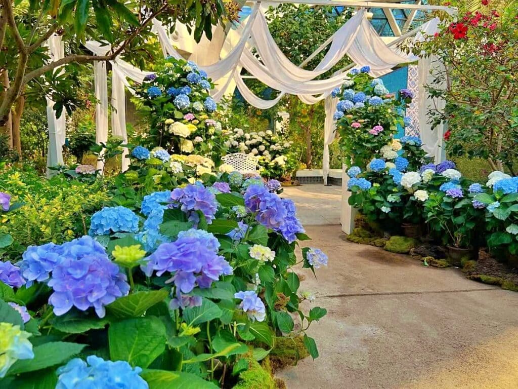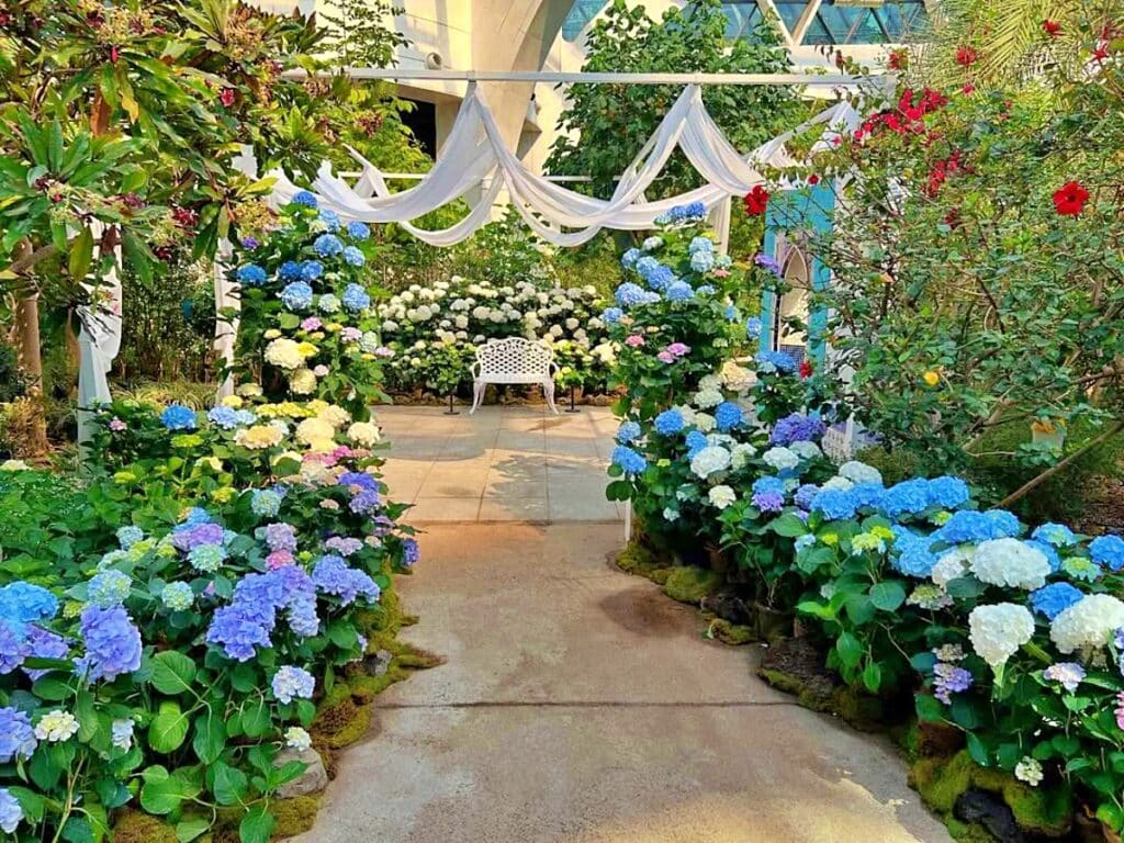 수국 전시가 열리는 지중해관에서는 각기 다른 색상과 꽃 모양, 높낮이의 수국들을 배치해 로맨틱한 분위기의 포토존을 연출하였다.