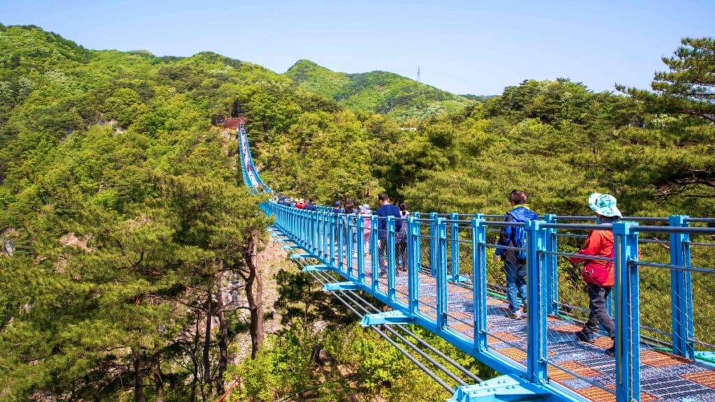 가장 먼저 마주하는 출렁다리는 길이 200미터, 높이 100미터 규모로, 실제 걸을 때의 흔들림과 고도 체감이 강한 편이다.