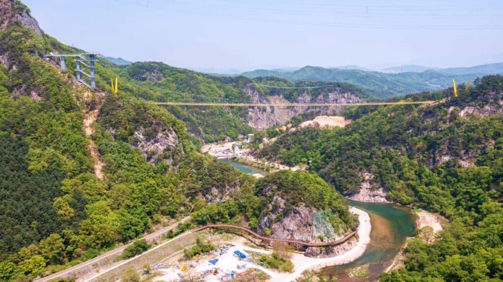 핵심 시설인 출렁다리는 길이 200미터, 높이 100미터, 폭 1.5미터 규모로 설계돼 실제 체감 고도감이 크다. 흔들림과 경사 변화가 함께 작용해 걷는 동안 긴장감이 유지된다.